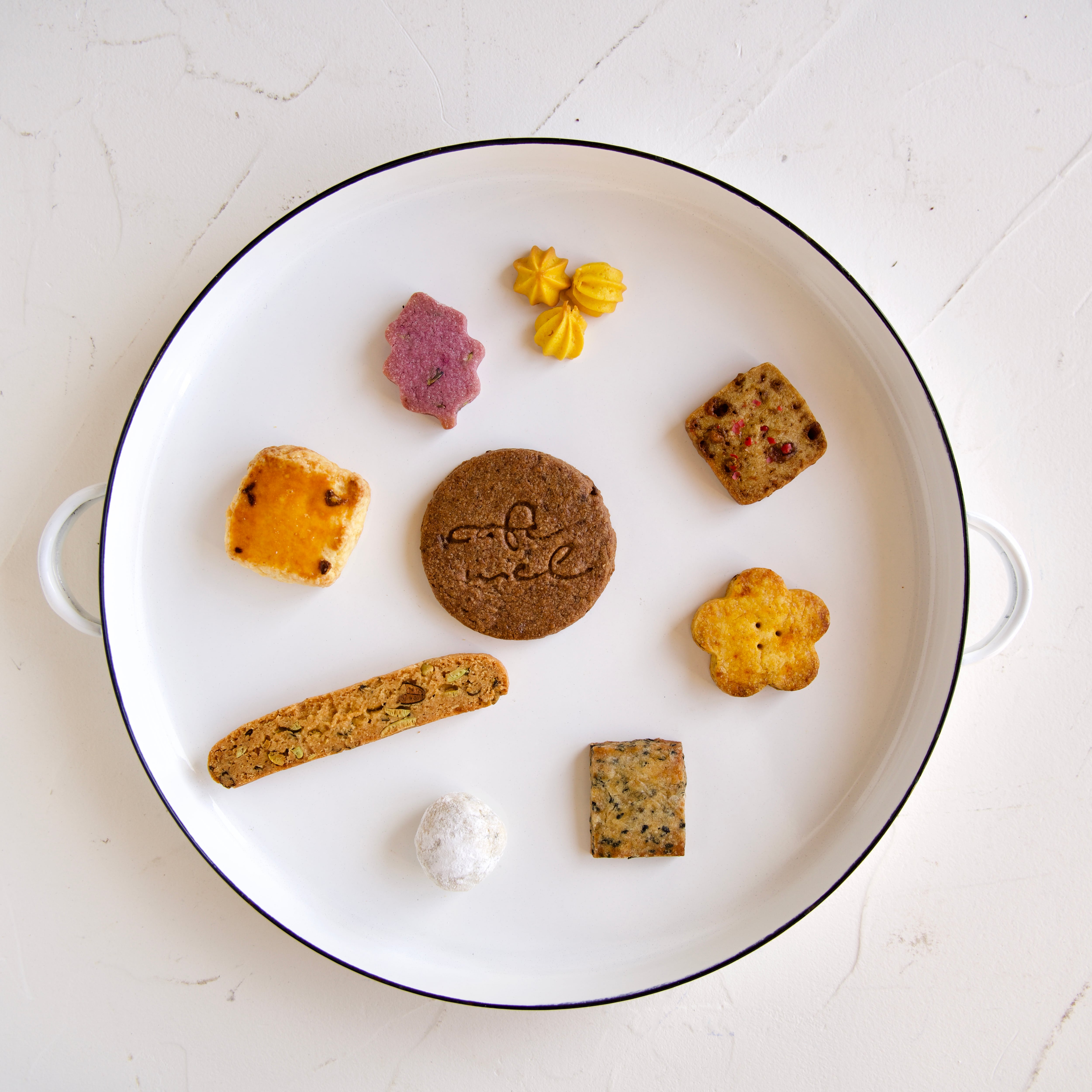 小麦粉(北海道)、バター、発酵バター、きび砂糖、グラニュー糖、アーモンドプードル、全粒粉、黒糖、卵、圧搾菜種油、粉砂糖、胡桃、黒豆、棗、クコの実、有機黒胡麻、きなこ、ウコン、クーベルチュールチョコレート、ココアパウダー、甘糀、コーンスターチ、赤胡椒、ジャスミン茶葉、練乳、紫芋、食用ラベンダー、桂皮、柚子果汁、陳皮、乾姜、アニスパウダー、自然塩