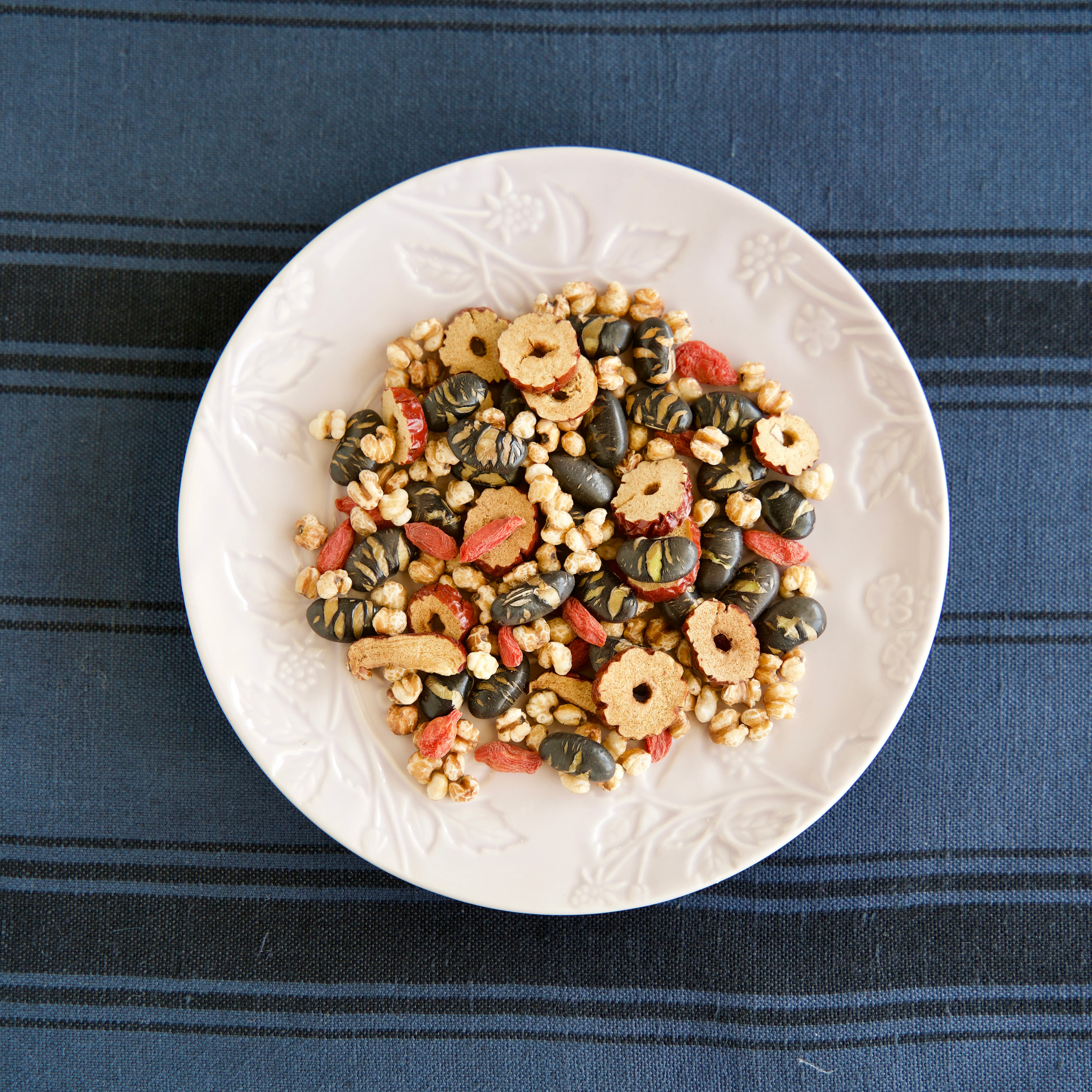 具材もまるごと食べられる、薬膳素材のブレンドティー。お茶にせず、そのままポリポリ食べたり、グラノラのように牛乳やヨーグルトをかけたり、お好きな方法でお召しあがりください。甘味料などの無添加なので、お好みではちみつやジャムで甘みをつけても。