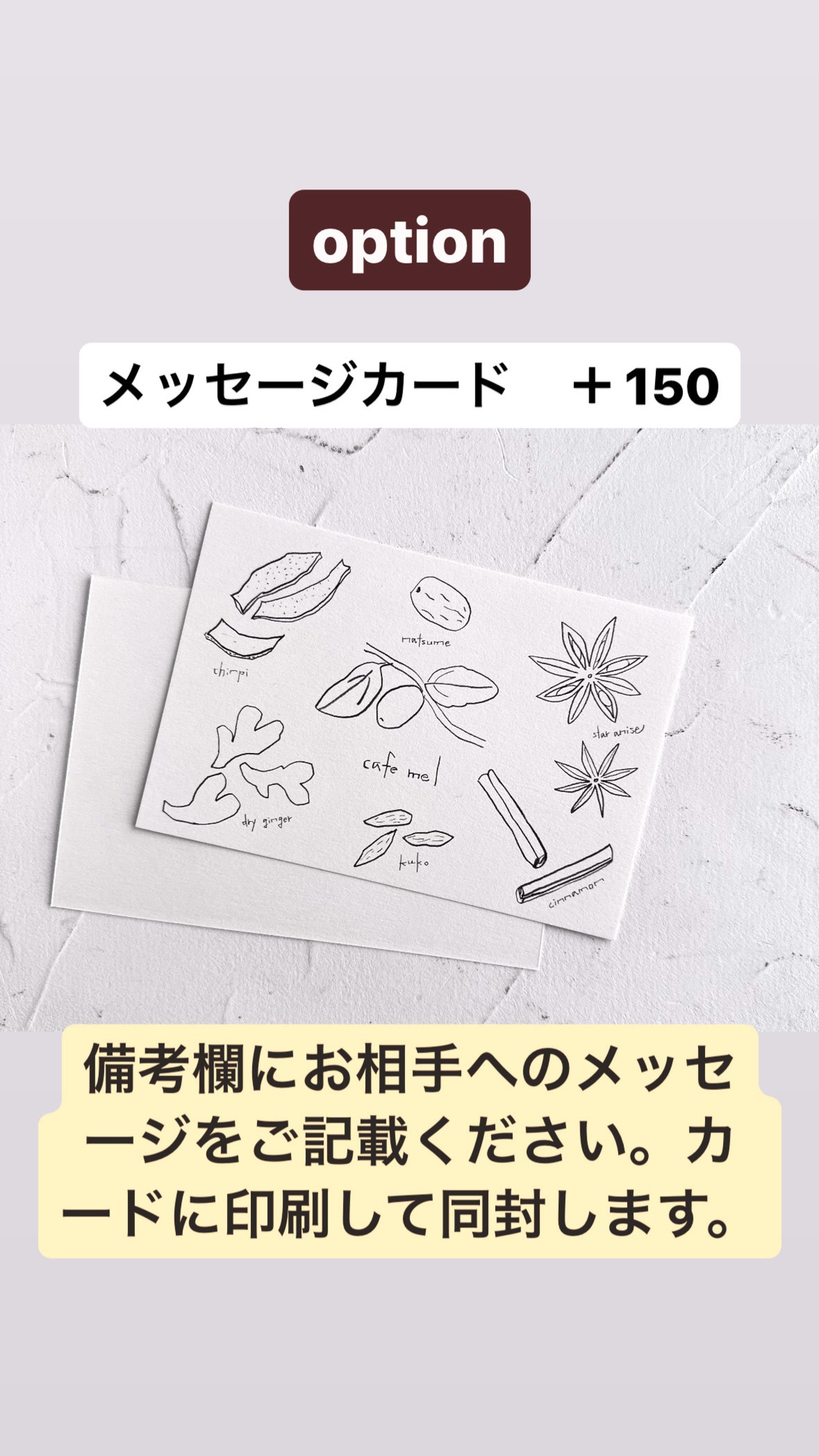 メッセージカード: 備考欄に、150文字以内で印刷したい文章をご記載ください。