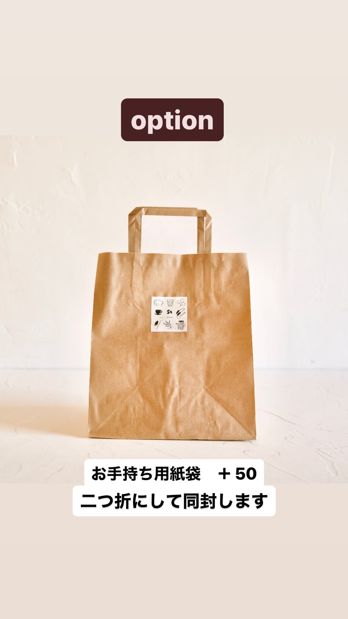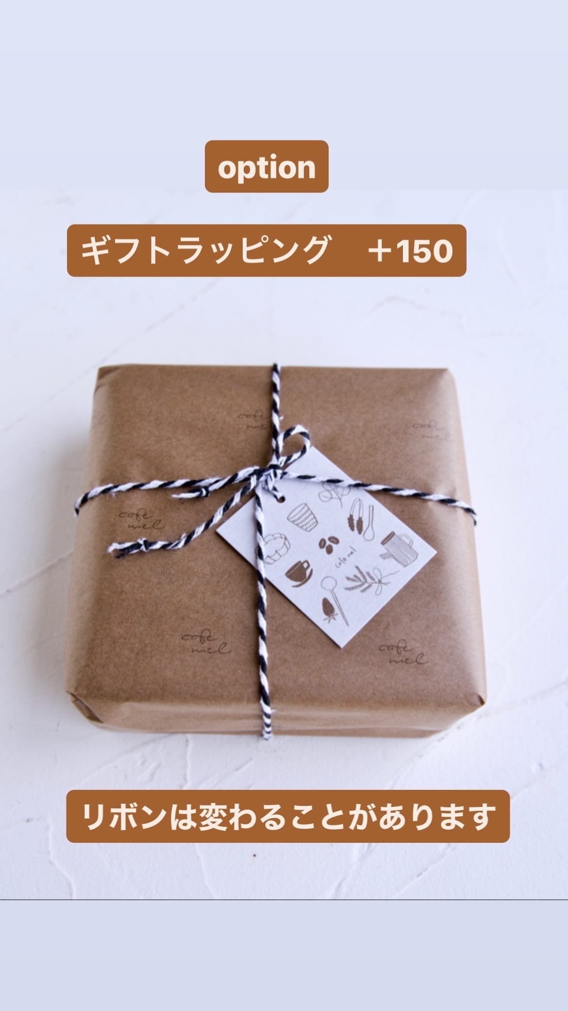 オプションにて、ラッピング・メッセージカード・お手持ち用紙袋(二つ折りにて同封)から必要なものを選んでください。