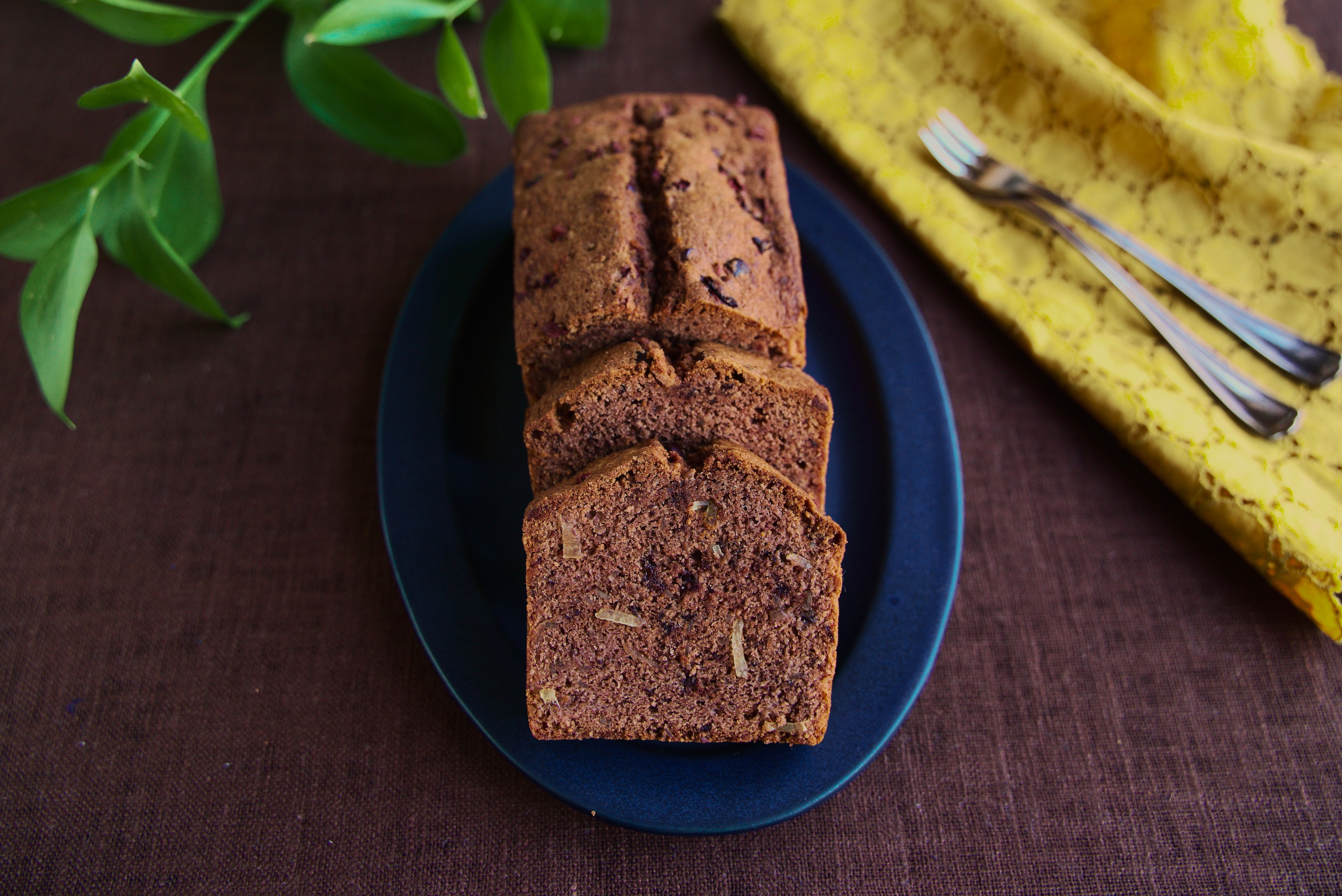 無農薬生姜をシナモンなどのスパイスとともにコンポートにし、クーベルチュールチョコレート、オーガニックカカオニブとともにパウンドケーキにしました。リッチで口溶けのよい生地に、シャリッとした生姜とカリッとしたカカオニブがアクセントとなっている大人のデザート。生姜は丁寧に下処理をしていますので、辛すぎることもありません。バレンタインの贈り物にもぴったりです。